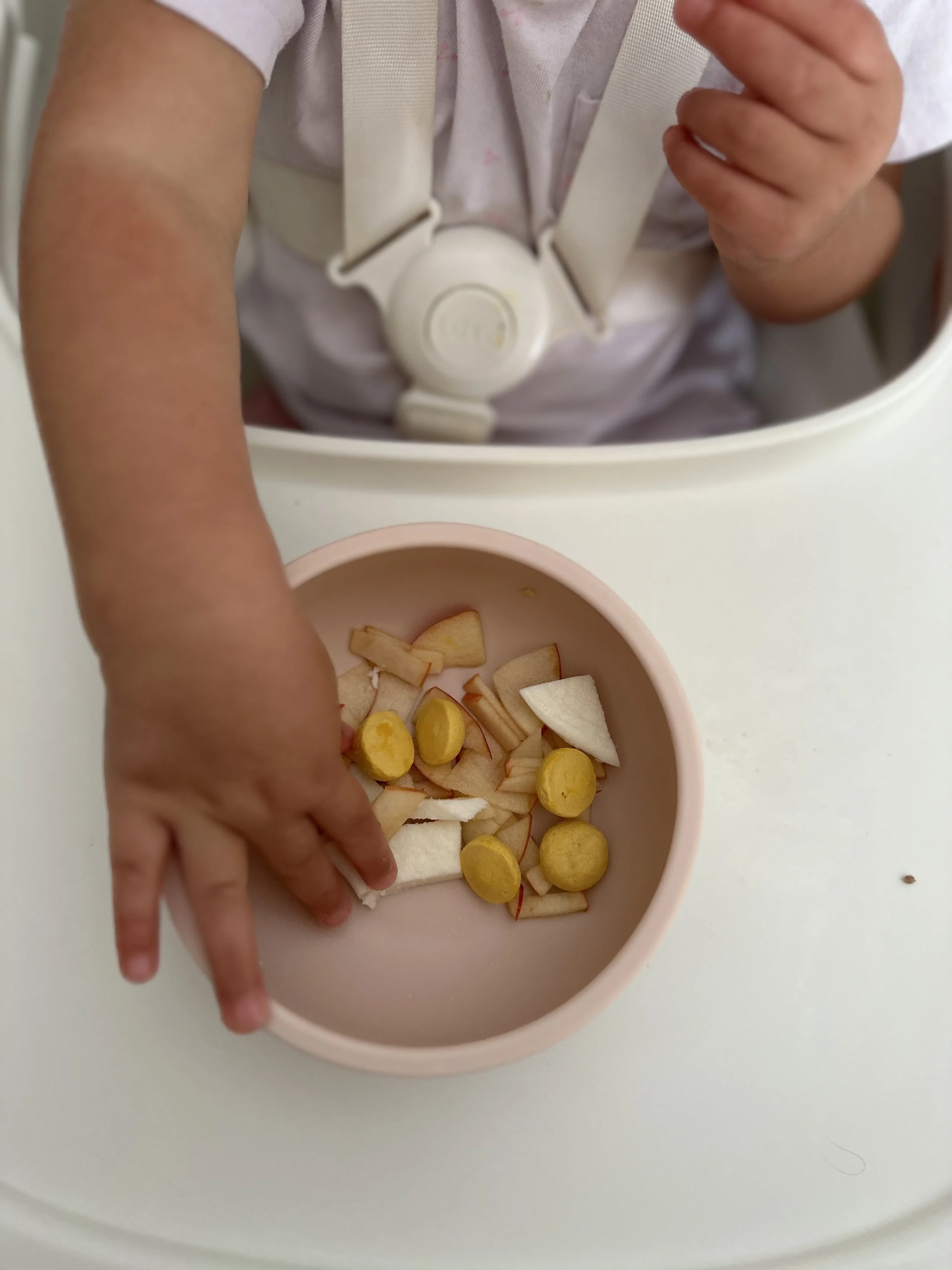Amara Melts mixed with thin apple slices and mozzarella cheese as a snack for my 13 month old.